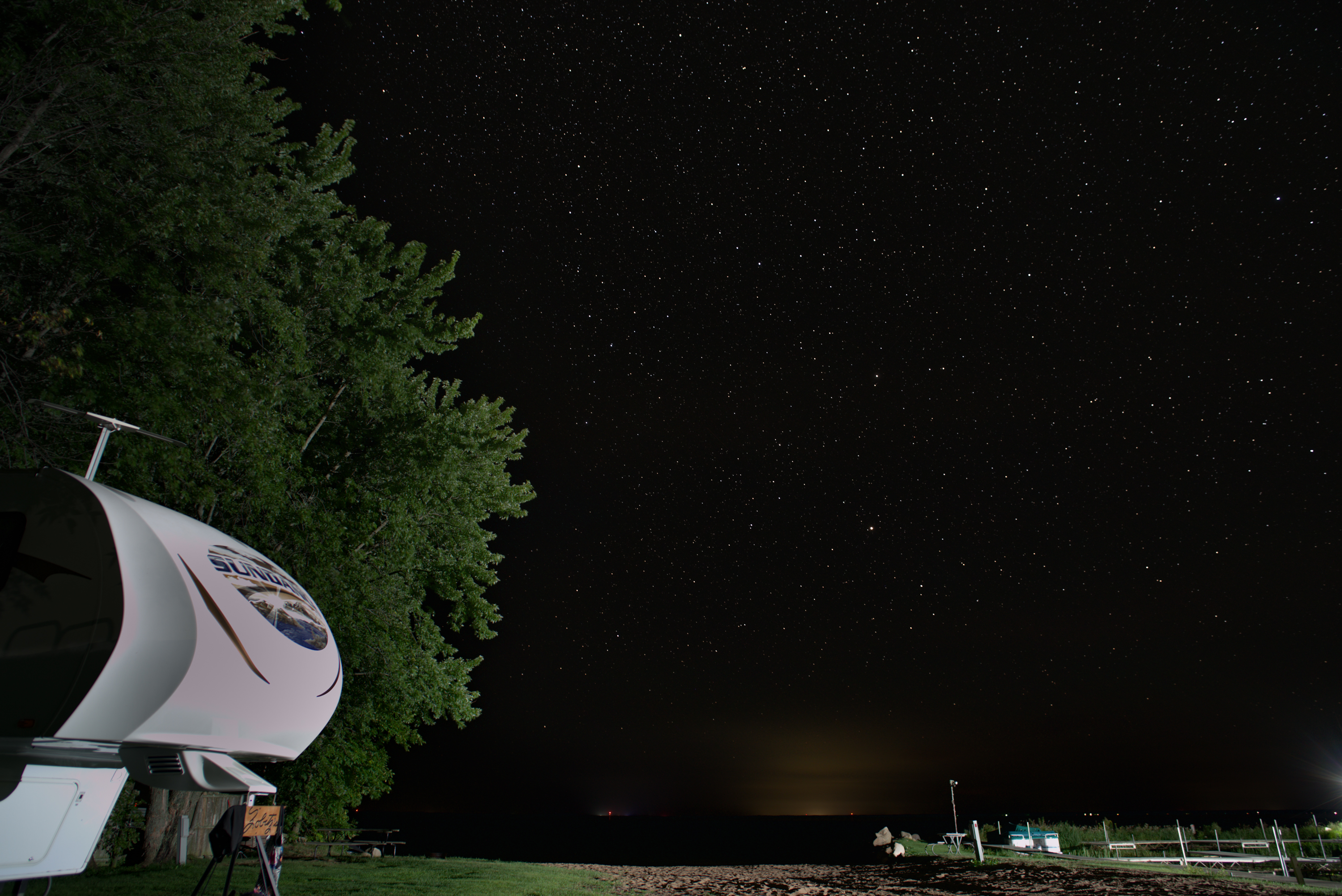 There is a longer beach at the campground with low water this year. It makes a nice foreground for the starry sky. Glow in the background is city across the lake 17 miles or so away.