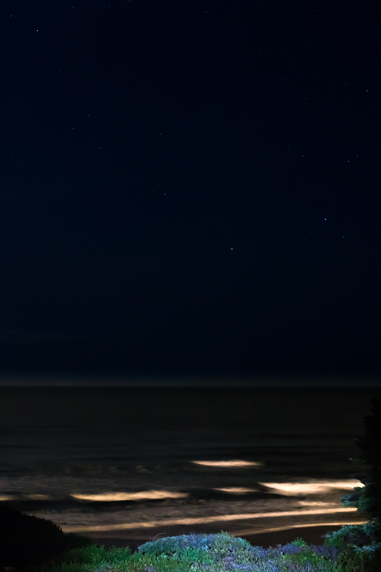 The moonlight makes interesting coloring of the waves. Unfortunately, between the moon and the lingering light to the west, there are only a few stars.