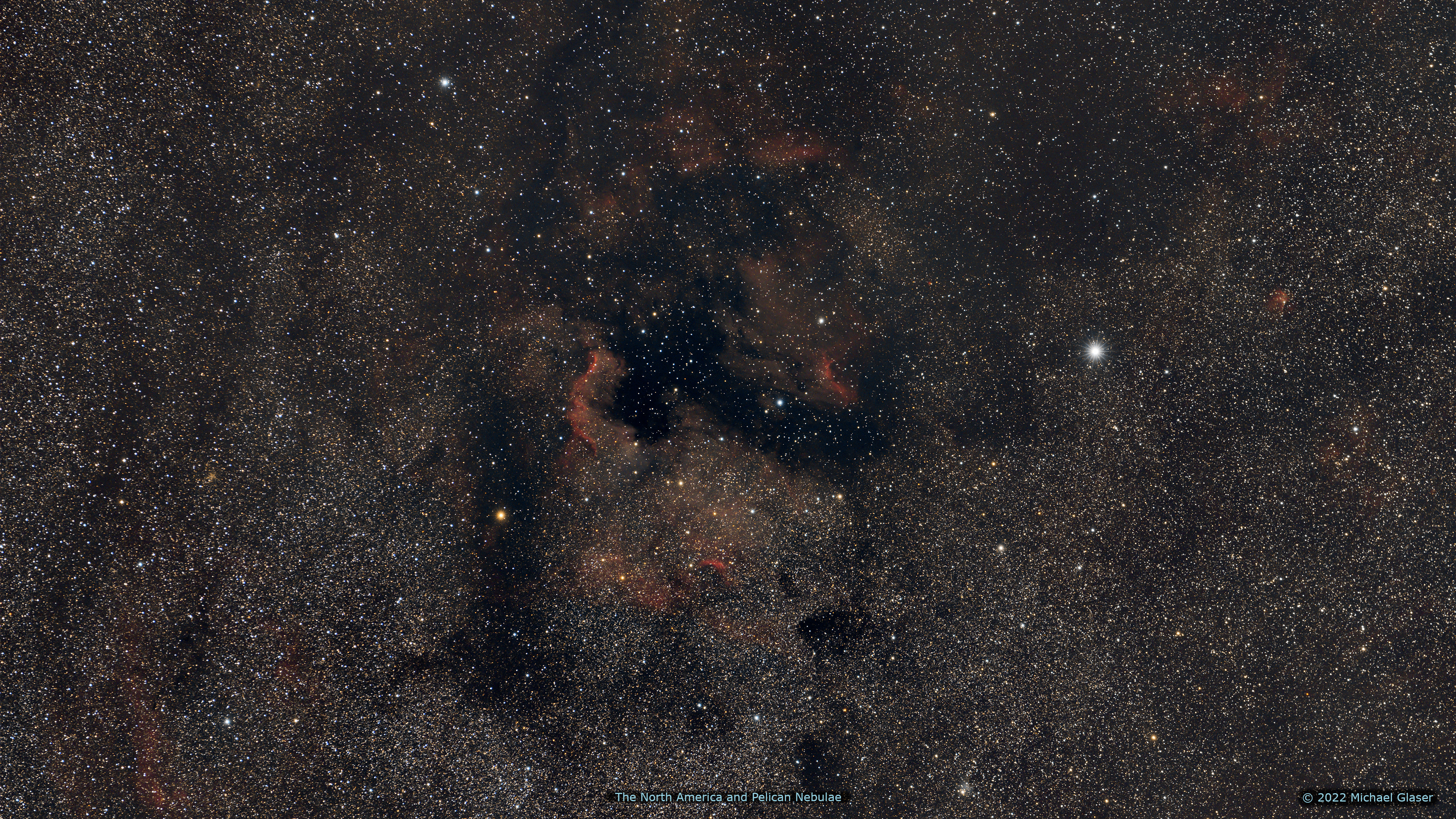 A wide field image of The North America and Pelican Nebulae shot with a Samyang 135mm lens and a ZWO ASI2600MC APS-C sized camera.