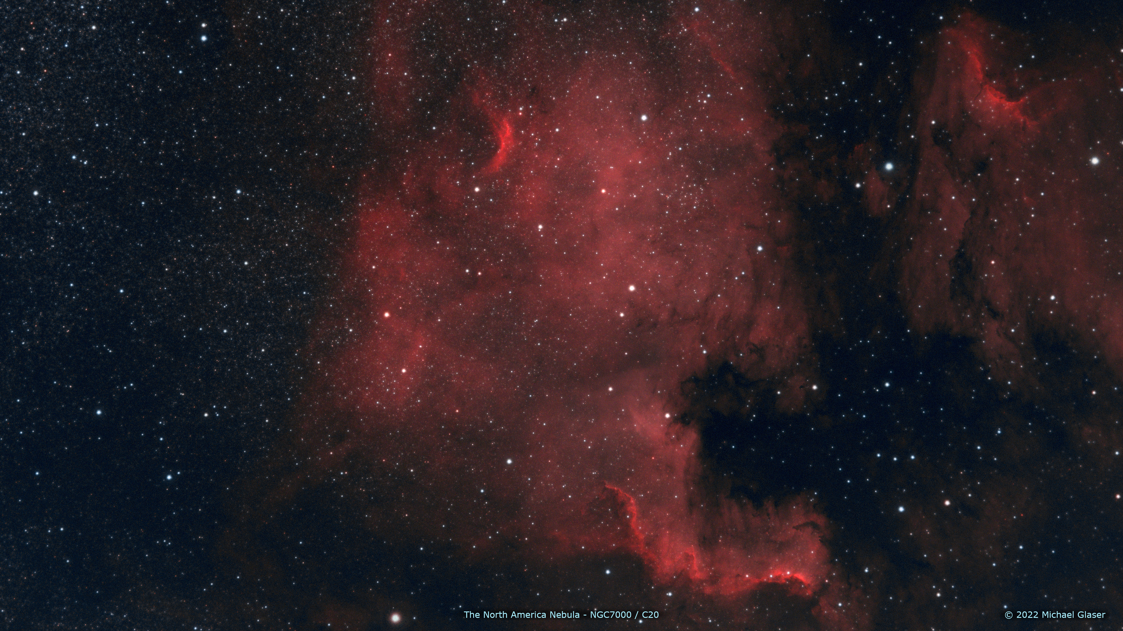 The North America Nebula is an emission nebula in the constellation Cygnus, close to Deneb. The shape of the nebula resembles that of the continent of North America, complete with a prominent Gulf of Mexico.