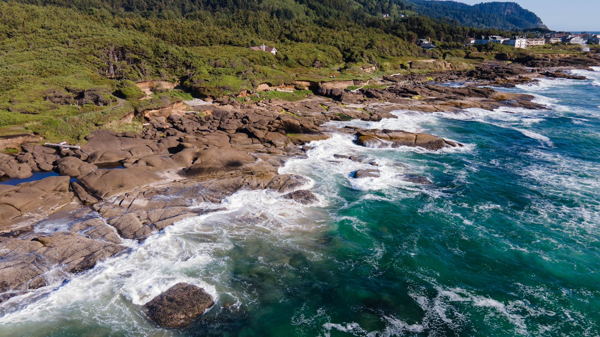 Drone looking down the coast - over the typically rocky shore and you can see a resort area in the distance.