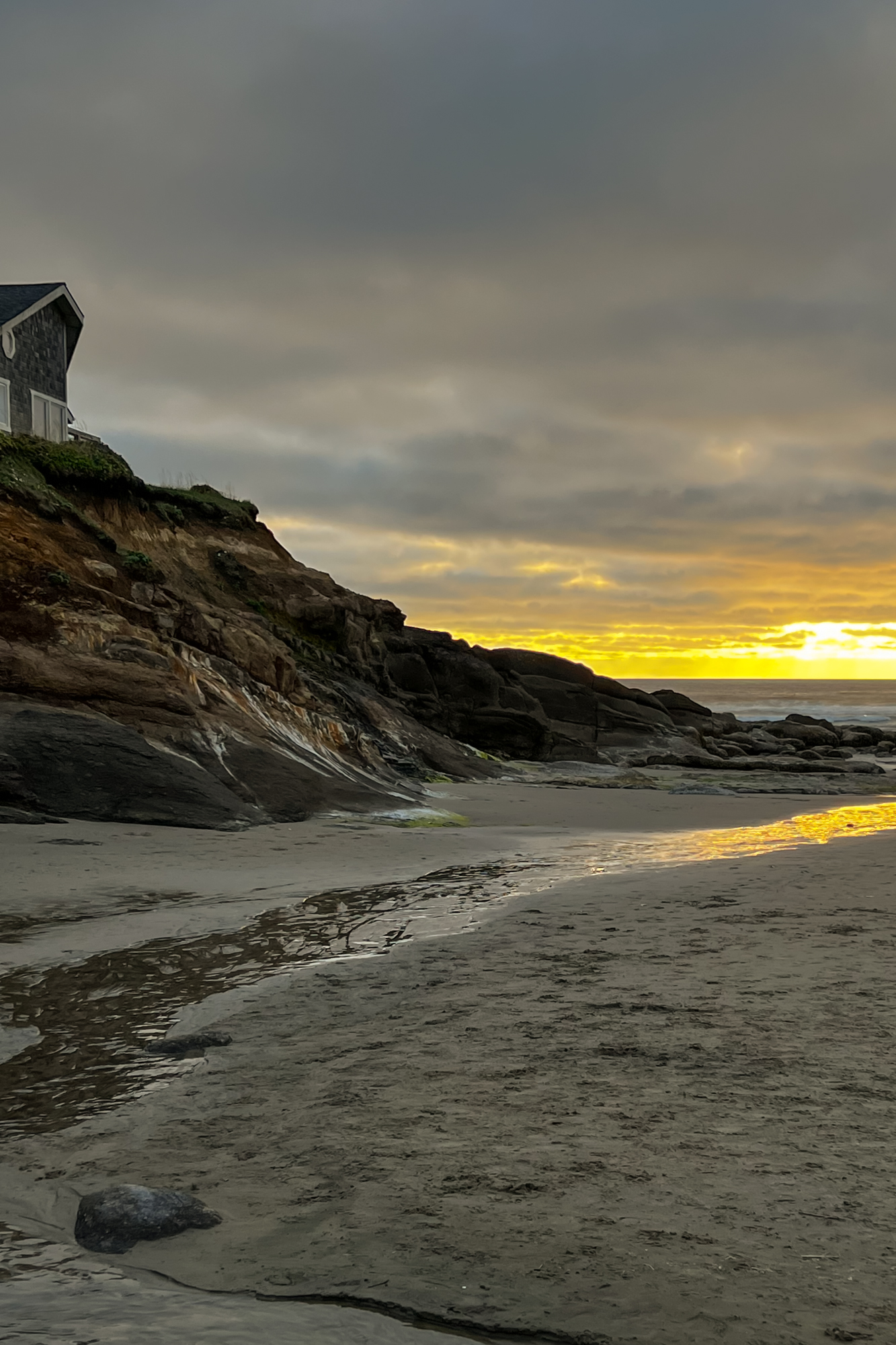 The house and the rocks, as well as the sand and water, highlight the orange and gray colors of the sunset. I like the reflection of the sunset in the rivulet in the foreground.